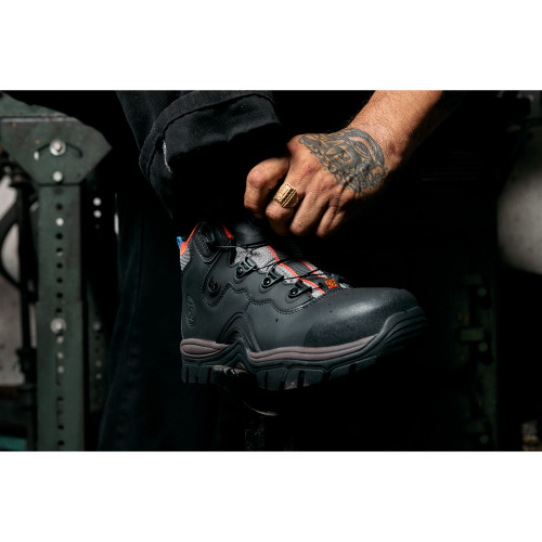 The Navigator Work Men's Black, Orange, Light Gray and Blue Work High Top takes that bold 90s style a step further with extra armor to make it our toughest work boot ever. The traditional lacing system is replaced with BOA® Fit System which delivers a micro-adjustable, precision fit, engineered and guarantee to perform in the toughest conditions. A rubber bumper and molded heel counter help you navigate all obstacles throughout your work day.